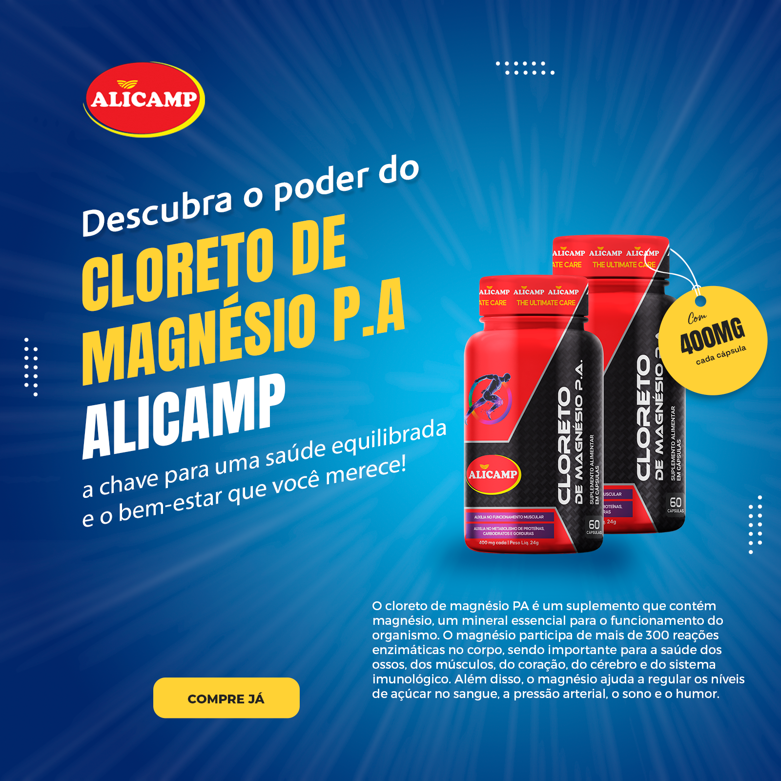 Recupere sua vitalidade com Cloreto de Magnésio P.A Alicamp! Essencial para o bem-estar muscular e nervoso. Transforme sua rotina e sinta a diferença. Alicamp, seu aliado na busca por uma vida mais saudável!